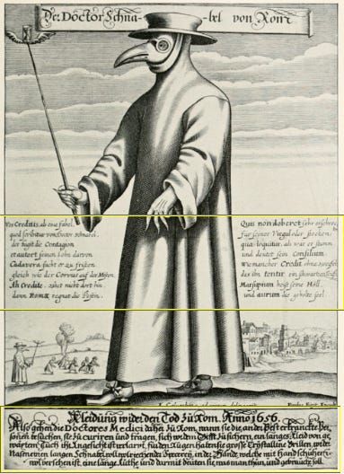 Copper engraving of a plague doctor of 17th-century Rome, by Paulus Fürst, 1656.